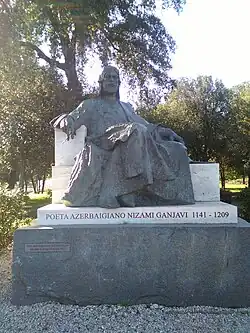 - ↑ «Gəncədə Nizami Gəncəvinin restavrasiya olunmuş heykəlinin açılışı olub » Dəyərlər AİN». deyerler.org (en ruso). Archivado desde el original el 10 de marzo de 2013. Consultado el 10 de septiembre de 2018.