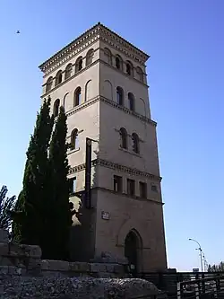 La torre semeja los alminares almohades, con dos cuerpos cuadrados concéntricos entre los que sube una escalera con cubrición de bóveda de aproximación. La torre interior alberga varios pisos de habitación cubiertos con bóveda de arista. Al exterior presenta tres cuerpos separados por impostas con decoración de cerámica vidriada blanca y verde, arcos mixtilíneos, ventanas en arcos túmidos y de herradura.