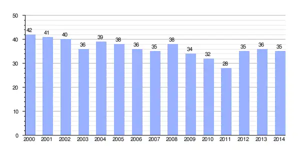 | Gráfica de evolución demográfica de Moral de Órbigo[2] entre 2000 y 2014 |