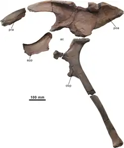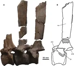 Llegaba a medir 6 metros de longitud.[1] Los autores de su descripción establecieron algunos rasgos distintivos. Todos estos son autapomorfias, o características únicas derivadas. Las espinas neurales más largas alcanzan una altura equivalente al menos a 4.3 veces la altura de sus cuerpos vertebrales. Las vértebras dorsales del medio tiene una depresión muy profunda entre sus procesos articulares y en la base de la espina neural, de 2.6 veces más alta que la longitud de su base, medida desde el frente hasta atrás. La costilla de la vértebra dorsosacral está fusionada con el resto del sacro. En la segunda y tercera vértebras del sacro hay una quilla en la zona inferior limitada a la parte frontal del cuerpo de la vértebra. En la cuarta vértebra sacral la quilla tiene una posición similar pero es más baja y ancha. Las facetas para las costillas de las vértebras dorsosacral y la primera sacral están situadas muy cercanamente, cerca del borde superior del ilion, más alto que las facetas de las otras costillas sacrales. La cresta en la cara interna de la "bota" posterior del ilion corre oblicuamente por detrás y arriba, formando una placa levemente protuberante, dirigida hacia adentro, en la zona posterior de la bota posterior. El extremo inferior del isquion tiene una sección transversal en forma de letra D debido a la extensión de la cara exterior.[1]