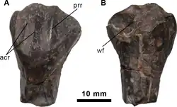 El holotipo, CMP-MS-03, fue hallado en una capa de la Formación Arcillas de Morella, la cual ha sido tradicionalmente datada de inicios del Aptiense, pero de acuerdo con la investigación palinológica quizás data de finales del Barremiense. Este espécimen consiste de un esqueleto parcial que carece de cráneo. Contiene un diente inferior derecho, siete vértebras dorsales, fragmentos de las espinas neurales de las vértebras de la espalda, dos piezas de costilla, un sacro, dos cheurones y una tibia derecha.[1]