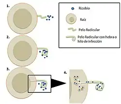3.Los rizobios entran por la parte apical del pelo radicular donde las células se degradan gracias a la acción de los factores Nod (6). Se forma una estructura conocida como “hebra o hilo de infección” producto de la fusión de vesículas, que se extiende en el interior del pelo radicular y llega hasta el Córtex (botánica) de la raíz (6). En esta zona las células corticales aumentan su división, formando un primordio de nódulo. Tanto la formación de la “hebra de infección” como la formación del primordio de nódulo se da por la reiniciación del ciclo celular en células corticales ya diferenciadas (5).