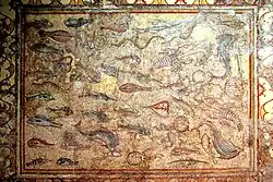 El mosaico formaba parte del suelo de una villa romana, siendo de estilo africano, en contraposición a los mosaicos helenísticos que abogaban por una líneas geométricas en sus motivos.