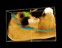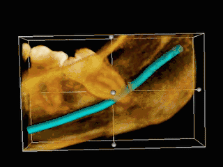 TAC 3D de una muela del juicio impactada adyacente al nervio alveolar inferior antes de la extracción de la muela del juicio. | ||