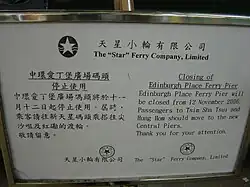 - ↑ a b c Kwoh, Leslie (13 de mayo de 2006). «Pier relocation spells gloom, says Star Ferry». The Standard (en inglés). Hong Kong: The Standard Newspaper Publishing. Archivado desde el original el 22 de mayo de 2011.