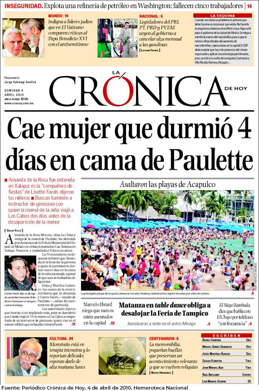 - ↑ Ken, Ellingwood (11 de abril de 2010). «In Mexico, 'Paulette' case more gripping than drug war». New York Times (en inglés). Consultado el 29 de diciembre de 2017.
