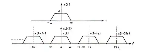 La influencia de los filtros de reconstrucción no ideales se observa fácilmente en el dominio de la frecuencia. En la siguiente figura se representa parte del espectro de una señal muestreada, supuesto sin distorsión y una posible característica de transferencia de un filtro paso-bajo real.