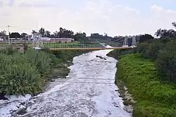 - Puente colgante sobre el río Laja.