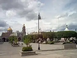 Plaza de San Miguel el Alto, se puede apreciar el templo de San Miguel Arcángel al fondo y el kiosko.Kiosko en el centro de la plaza de armas "Ramón Corona".
