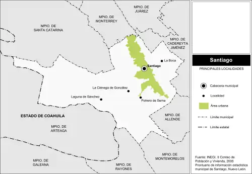 El municipio de Santiago es uno de los 51 municipios en que se encuentra dividido el estado mexicano de Nuevo León, cuenta con 46,784 habitantes repartidos en 214 localidades. Su cabecera es la ciudad de Santiago y forma parte de la Zona metropolitana de Monterrey[4] junto con otros diez municipios.