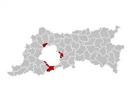 1. Comines-Warneton 2. Mesen 3. Mouscron 4. Spiere-Helkijn 5. Ronse 6. Flobecq 7. Bever 8. Enghien 9. Drogenbos 10. Linkebeek 11. Sint-Genesius-Rode 12. Wemmel 13. Kraainem 14. Wezembeek-Oppem 15. Herstappe 16. Voeren 17. Malmedy 18. Waimes 19. Lontzen 20. Raeren 21. Eupen 22. Kelmis 23. Burg-Reuland 24. Sankt Vith 25. Amel 26. Bütgenbach 27. Büllingen