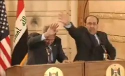 George W. Bush (izquierda) esquiva un zapato arrojado por al Zaidi. El primer ministro iraquí Nuri al Maliki (derecha) extiende un brazo para intentar rechazar el zapato, sin éxito.