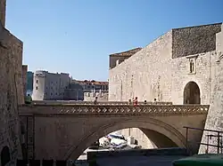La Puerta de Pila, o Puerta de Pile (pile significa «puerta» en griego),[27] es un complejo fortificado, con varias puertas, y defendido por el Fuerte Bokar y el foso que corría alrededor de la sección fuera de los muros de la ciudad.[10] En la puerta de entrada a la ciudad antigua, en el lado occidental de las murallas exteriores, hay un puente de piedra entre dos arcos góticos, que fueron diseñados por el prestigioso arquitecto Paskoje Miličević Mihov en 1471.[28] Ese puente se conecta con otro puente, un puente levadizo de madera, que aún puede ser levantado.[28] Durante la época de la república, el puente levadizo de madera de la Puerta de Pila era levantado cada noche con considerable pompa,[27] en la ceremonia se entregaban las llaves de la ciudad al rector de Ragusa.[20] En la actualidad, se extiende por un foso seco cuyo jardín ofrece un descanso de las multitudes.[20] Por encima de los puentes, sobre el arco de la puerta principal de la ciudad, hay una estatua del patrón local: San Blas, (en croata: Sveti Vlaho), con un modelo de la ciudad renacentista.[20]