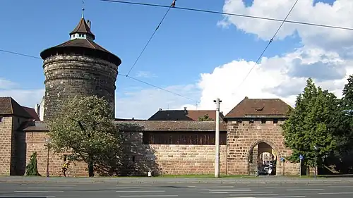 - ↑ a b «Nürnberger Unterwelten - Unüberwindbarer Schutzwall - die Stadtmauer». www.felsengaenge-nuernberg.de. Consultado el 28 de agosto de 2022.