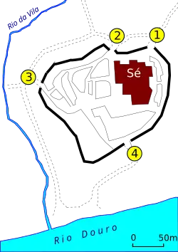 A mediados del siglo XIV, en medio de disputas entre el obispo y los burgueses sobre derechos de jurisdicción, fue notificado por los procuradores del Concejo que por motivos de defensa y debido a los desencuentros entre el rey Dionisio I de Portugal y su hijo el infante Don Alfonso entre los años 1320 y 1321, fueran mandadas demoler unas casas construidas junto al muro del castillo. La expresión castillo era ya una expresión corriente para referirse a las antiguas murallas. Ya el rey Sancho I de Portugal en una carta al obispo de Oporto le recomienda a este la realización de un mercado ante la puerta de la catedral para que el castillo sea mejor poblado.