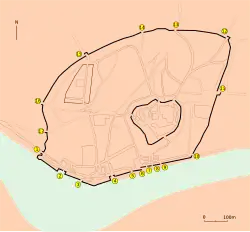 Durante mucho tiempo fue conocida como Muralla Sueva, pero hoy en día está identificada como de origen romano del siglo III, reconstrida en el siglo XII. Hoy en día apenas subsiste un reducido trecho y una torre, reconstruidos en el siglo XX.