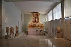 - Por otra parte, la sección dedicada a la vida religiosa alberga la representación de un santuario típico de la época clásica. En esta se encuentra una estatua de Cibeles hallada en Mosjato y una serie de destacados relieves votivos.