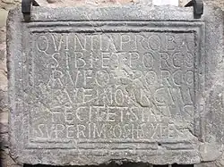 QUINTIA PROBA PARA SI Y PARA PORCIO RUFO Y PORCIO RUFINO, HA LEVANTADO EL ARCO Y HA SUPERPUESTO LAS ESTATUAS, POR VALOR DE 40.000 SESTERCIOS. LO HA HECHO ERIGIR (¿) POR TESTAMENTO.
