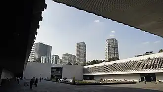 El Museo Nacional de Antropología (MNA) es uno de los recintos museográficos más importantes de México y de América.[4] Está concebido para albergar y exhibir el legado arqueológico de los pueblos de Mesoamérica, así como para dar cuenta de la diversidad étnica actual del país. El edificio actual del MNA fue construido entre 1963 y 1964 en el Bosque de Chapultepec por instrucción del presidente Adolfo López Mateos, diseńado por Pedro Ramírez Vázquez[5] y asistido por los arquitectos Rafael Mijares y Jorge Campuzano. El presidente Adolfo López Mateos lo inauguró el 17 de septiembre de 1964. Actualmente, el edificio del MNA posee 22 salas de exposición permanente, dos salas de exposiciones temporales y tres auditorios. En su interior se encuentra la Biblioteca Nacional de Antropología e Historia.