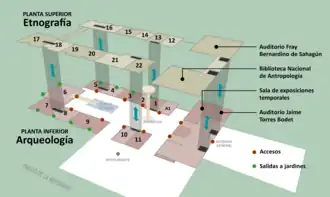 Las salas permanentes se encuentran distribuidas en las dos plantas del edificio. En la planta baja se localizan las salas dedicadas a la antropología y a las culturas prehispánicas del territorio mexicano, desde el Poblamiento de América hasta el Período Posclásico mesoamericano. En el segundo nivel se encuentran las 11 salas de etnografía, donde se exponen muestras de la cultura material de los pueblos indígenas que viven en México en la actualidad. A partir del año 2020 las salas etnográficas iniciaron un proceso de remodelación, en 2024 se abrieron los primeros dos espacios que se dividieron en Sala de Textiles y Sala de Fiestas, juntas exponen más de 1,300 piezas.[19] El 7 de enero de 2025 se permitió el acceso a otras tres salas remodeladas divididas en los ejes: Historias, identidades y resistencia; Pueblos, lenguas y territorios; Maíces, milpas, la tierra y el alimento, en total, las salas etnográficas suman cerca de 6,000 objetos en exhibición y el trabajo de 300 artesanas y artesanos.[20]