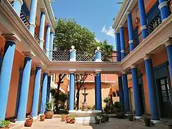 En el patio principal se encontraban las dependencias principales de la familia, bodegas, la escalera de honor que daba acceso al salón principal, un arco triunfal de medio punto y su remate de arco mixtilíneo, con un escudo de blasonería esculpido en piedra.[5]El segundo patio estaba destinado a las caballerizas y depósitos, mientras que el tercer patio consideraba las dependencias de servicio entre ellos la servidumbre indígena y esclavos.