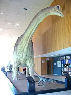 ![]() Vista del frente acristalado del museo, con recreaciones de titanosaurios. | ||