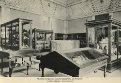 En 1868 las colecciones de antigüedades, arte y etnografía del Real Gabinete (que en 1815 había sido disuelto e integrado, junto con otras instituciones, en el nuevo Real Museo de Ciencias Naturales de Madrid, antecedente directo del actual Museo Nacional de Ciencias Naturales) fueron transferidas al Museo Arqueológico Nacional, creado el año anterior, a las que se sumaron las del Museo de Medallas y Antigüedades de la Biblioteca Nacional, que tenía algunas piezas americanas, las de la Escuela Superior de Diplomática y las de la Real Academia de la Historia.[7][8][9] Del Museo Arqueológico a su vez se separarían las de origen americano (hasta entonces en la Sección IV o de Etnografía) por el Decreto de creación del Museo de América, de 19 de abril de 1941, que establecía que «El fondo inicial lo constituirán las colecciones de Etnografía y Arqueología americanas existentes en el Museo Arqueológico Nacional, con sus libros, vitrinas y mobiliario».[nota 1] Aunque el decreto fundacional no las mencionaba, también pasaron al nuevo museo las colecciones de Filipinas y Oceanía, al igual que una pequeña colección africana y el conjunto de cerca de cien objetos samis que había sido donado al MAN en 1896 por el ingeniero sueco Åke Sjögren.[10]