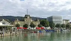La plaza peatonal cerrada por los dos edificios del proyecto y por el teatro mira hacia una calle perteneciente al casco antiguo de Bregenz, y en el lado opuesto está la costa del lago. Frente al Museo de Arte hay un espigón que se adentra en el agua y en él hay un embarcadero repleto de yates. En uno de los planos urbanos de situación que hizo Zumthor se aprecia perfectamente este espigón y los edificios que rodean los dos bloques del proyecto. La plaza peatonal antes descrita no tiene vegetación y está en el lado sureste del edificio de exposiciones. En el lado noreste hay otra plaza en la que hay árboles y una estatua.