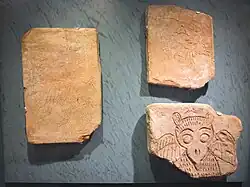 | Diversos ladrillos grabados. | Ladrillo del dios Ahkal Te' Chaahk Ohl K'uh | Una de las 7 urnas funerarias encontradas | Uno de los 4 601 ladrillos grabados | Recipientes de barro. | |||