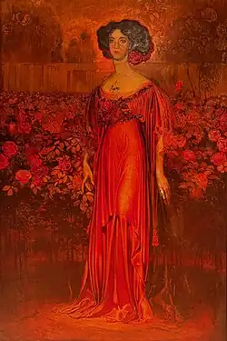 - Representa la continuación de su etapa simbolista. Es un retrato de cuerpo entero en el que la altiva actitud de la mujer viene a entroncar con una composición rígida, carente de movimiento, en la que los intensos tonos rojos y naranjas inundan el lienzo.