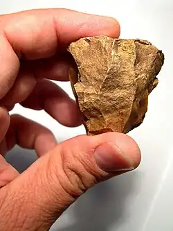 - Un plano de percusión (a veces denominado también «plataforma de percusión») o varios: es decir, la zona que recibe los golpes o que sufre la presión necesaria para que la roca se rompa y puedan extraerse los productos deseados. Los planos de percusión pueden ser de diversos tipos, aunque básicamente se diferencian los planos de percusión corticales, esto es, debidos a una talla monofacial, de los no corticales, propios de una talla bifacial y, dentro de estos, aquellos que han podido ser preparados cuidadosamente por medio de pequeños lascados, para que la extracción sea más precisa (planos de percusión preparados). Cuando se extrae una lasca, una parte del plano de percusión se va con ella, es lo que denominamos talón de la lasca, el cual puede ser cortical, si el plano de percusión lo es también; también puede ser liso, o diedro, cuando se trata de una extracción por talla bifacial, o, por último, facetado, en el caso de que el plano de percusión haya sido preparado.