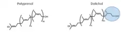 Tanto en eucariotas como procariotas presentan un precursor lipídico sobre el que se ensambla de forma secuencial una estructura oligosacárida conservada (core) que constituye la porción glicana que se traspasa en primer lugar al sitio de glicosilación. En procariotas este precursor se denomina poliprenol y en eucariotas dolicol. Ambas moléculas están compuestas por la condensación de una molécula de farnesilo pirofosfato con un número variables de moléculas de IPP (isopentenil difosfato). Las moléculas de IPP se pueden incorporar tanto en cis (m) como en trans (n). Evolutivamente, el número de moléculas en cis es muy variable (desde 8 en bacterias hasta 37 en algunas plantas, el hombre tiene entre 14 y 17) mientras que las moléculas en trans se ha mantenido constantes (2 ó 3). La única diferencia estructural existente entre el poliprenol y el dolicol es la α-saturación del carbono 3 (esencial en eucariontes superiores).