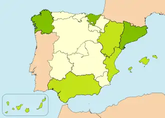 Las comunidades autónomas que incluyen en su Estatuto de Autonomía un autorreconocimiento como «nacionalidad» o «nacionalidad histórica»,[12] y que por tanto son legalmente reconocidas como tales, son Andalucía (1981 y 2007), Aragón (1996 y 2007),[13] Islas Baleares (1983 y 2007), Canarias (1996 y 2018), Cataluña (1979 y 2006), Comunidad Valenciana (2006), Galicia (1981) y País Vasco (1979). Mientras que Asturias, Cantabria y Castilla y León[14] son autodenominadas por sus respectivos Estatutos de Autonomía como «comunidades históricas», el resto excepto Madrid utilizan las denominaciones de «regiones históricas» o «identidades históricas». Todas estas terminologías son equivalentes desde el punto de vista legal.