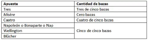 | Napoleón o Bonaparte o Nap | 5/5-El declarante abre el carteo con el triunfo más bajo primero. | Diez puntos de cada jugador al declarante. | Diez puntos a cada jugador del declarante. |