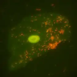 Cuando está asociado al ADN, el naranja de acridina es espectralmente similar a la fluoresceína, presentado un máximo de excitación a 502 nm y una emisión a 525 nm (en el verde). Cuando está asociado al ARN, la excitación máxima deriva a 460 nm (en el azul) y la emisión máxima a 650 nm (en el rojo). Por lo tanto, este colorante tiñe de verde a las células en fase de división activa (mucho ADN), y de naranja a las que están en reposo multiplicativo (mucho ARN y proteínas). El colorante se utiliza frecuentemente en microscopía de epifluorescencia. Se lo prepara a partir del aceite de creosota y del alquitrán de hulla. Se lo utiliza conjuntamente con el bromuro de etidio para diferenciar entre células vivas y apoptóticas.[1][2] El naranja de acridina es además un mutágeno que tiende a producir mutaciones de desplazamiento del marco de lectura.[3]