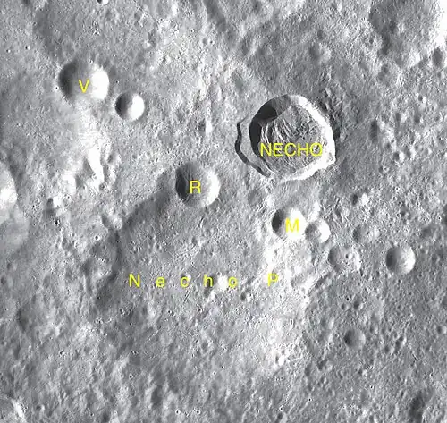 Por convención estos elementos son identificados en los mapas lunares poniendo la letra en el lado del punto medio del cráter que está más cercano a Necho.