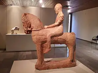 La necrópolis ocupa una extensión de 0,5 ha con una cronología de los siglos VI al IV a. C., y fue utilizada durante más de seis generaciones. Entre los materiales destaca el complejo escultórico que representa un guerrero a caballo de principios del siglo V a. C. (en torno al 490 a. C.), considerada la escultura ibérica de mayor tamaño (1,8 m de altura), cuyo pedestal apareció "in situ" en el momento de la excavación en una tumba de adobe, y que va vestida de modo similar a los guerreros de Porcuna, y con caballo ricamente ataviado. Una segunda escultura corresponde al Jinete a caballo, encontrada sobre la tumba tumular n.º 20, fechada gracias a los materiales asociados que incluyen 10 cántaros de San Valentín, en torno al 410 a. C. Algunas tumbas, como la n.º 25, que han sido excavadas, han proporcionado abundantes materiales procedentes de un banquete funerario (silicernium). Destacan las cerámicas de importación, procedentes de Grecia, como un enócoe ático, un askos, aríbalos, y otras, presumiblemente comercializadas a través de Emporion (Ampurias).