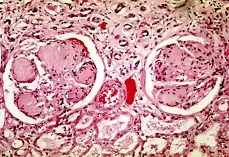 ![]() Dos glomérulos en la nefropatía diabética: las áreas acelulares de color púrpura claro dentro de los mechones capilares son los depósitos destructivos de la matriz mesangial. | ||