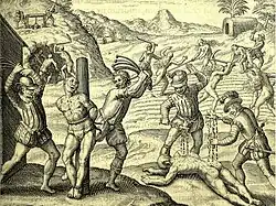 Por ejemplo, historiadores de países coloniales han escrito que los pueblos indígenas tienen prácticas generalizadas como el canibalismo o el sacrificio humano. Sin embargo, gran parte de estas calumnias y acusaciones exageradas servían para justificar ideológicamente la destrucción de las naciones indígenas y el colonialismo.[99][100][101][102][103][104][105][106] El historiador David Stannard escribe: «... los europeos conquistadores estaban deshumanizando deliberada y sistemáticamente a las personas que estaban exterminando».[107] Los pueblos indígenas han sido deshumanizados en relatos de intelectuales europeos como Juan Ginés de Sepúlveda para justificar su esclavitud, opresión e incluso exterminio. Controvertidos relatos de estos pueblos circularon en Europa en traducciones de cartas de Cristóbal Colón.[108] Sepúlveda usó referencias a la Biblia para representar a los nativos americanos como esclavos naturales.[109]
