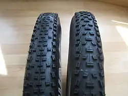 Vienen en tres tipos básicos de huella: lisa, nudosa y multiuso. Los neumáticos lisos hacen de una bicicleta de montaña lo más parecido posible a una de carretera, por desgracia, por lo general son tamaños estrechos y de alta presión y el tamaño de la rueda más pequeña tiende a resultar en un andar más bien duro. (En general, cuanto menor sea el diámetro de los neumáticos, más se sentirán los golpes, baches y otras irregularidades del pavimento, en comparación con los neumáticos anchos con la presión correcta de funcionamiento.) Los nudosos son generalmente una buena elección para su uso campo a través y los multiuso para carretera y campo a través.