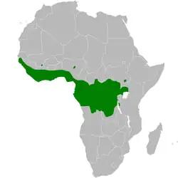 Se encuentra en Angola, Benín, Camerún, República Centroafricana, República del Congo, República Democrática del Congo, Costa de Marfil, Guinea Ecuatorial, Gabón, Gambia, Ghana, Guinea, Guinea-Bissau, Liberia, Mali, Nigeria, Senegal, Sierra Leona, Sudán del Sur, Tanzania, Togo y Uganda.