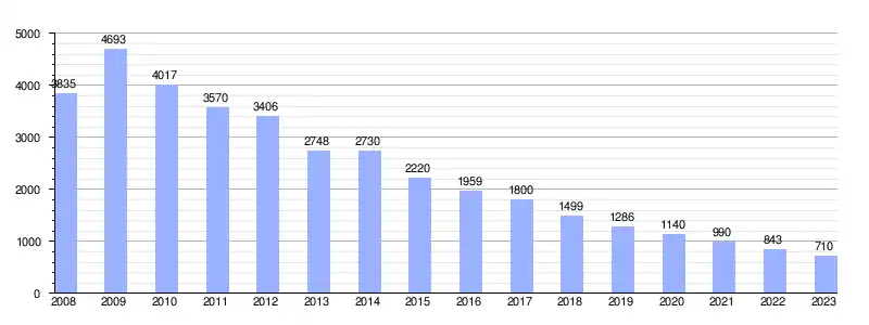 | Gráfica de evolución demográfica de Noáin (Valle de Elorz) / Noain (Elortzibar)[22] entre 1842 y 2021 |