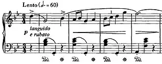 Esta obra empieza con una sección expresiva y brillante en la tonalidad de la pieza, con una melodía tranquila y melancólica y un tempo de Larghetto; hasta llegar a una parte central más tierna y dulce en re bemol mayor, donde la mano derecha toca octavas, sextas, y terceras haciéndose más aguda con el avance de esta parte, mientras la otra mano sigue con los arpegios de corcheas. Concluyendo esta sección regresamos a la parte inicial en si bemol menor presentando algunas alteraciones en la melodía para llegar al final, con un acorde de si bemol mayor.