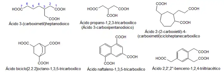 Si dos grupos carboxilo se encuentran distribuidos en dos estructuras independientes, uno de ellos se menciona como "carboxilalquil-". Cuando dos estructuras idénticas que contienen grupos carboxilo se unen a un grupo vinculante, se puede mencionar por nomenclatura multiplicativa.