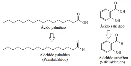 Conceptualmente, el ácido carbónico puede tener varios compuestos derivados por sustitución de los grupos - OH con grupos carbonados o hidrógeno. Un reemplazo con hidrógeno genera el ácido fórmico; un segundo reemplazo genera el formaldehído. Un reemplazo de un hidrógeno por un grupo alquilo genera al grupo aldehído.