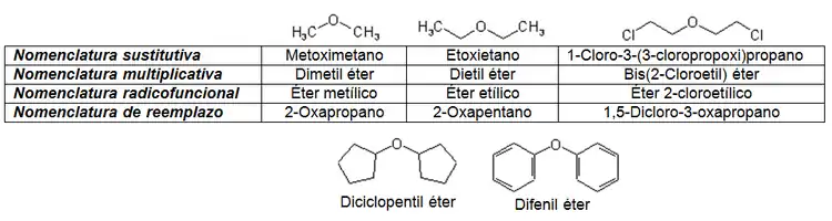 - Monoéteres simétricos: Puede utilizarse la nomenclatura multiplicativa, de reemplazo, sustitutiva o radicofuncional.