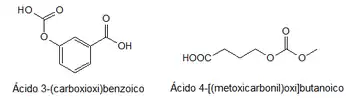 - Si dos unidades moleculares idénticas independientes se enlazan por una unidad de carbonato, ésta puede ser indicada como "carbonildioxi-"
