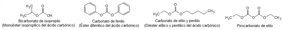 - Carbonatos de alquilo: Se nombran por nomenclatura radicofuncional. Dado que el ácido carbónico es un diácido, puede haber derivados de mono o di disustitución simétricos o asimétricos.