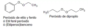 - (a) La nomenclatura radicofuncional menciona a los compuestos como peróxidos de alquilo. Si el sustituyente se repite, se utiliza el prefijo multiplicativo "di-"; si son alquilos distintos, se mencionan por orden alfabético.
