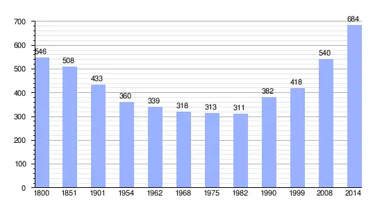 Los datos demográficos contemplados en este gráfico de la comuna de Notre-Dame-d'Allençon[4] se han cogido de 1800 a 1999 de la página francesa EHESS/Cassini, y los demás datos de la página del INSEE.[5]
